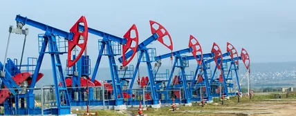 A row of oil pump jacks working in an oil field